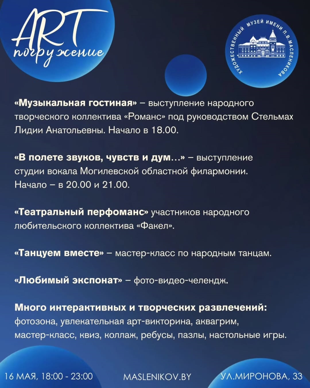 «Ночь музеев» – ежегодная акция, во время которой тысячи музеев по всему миру открывают свои двери для всех желающих насладиться искусством. В этом году она пройдет 16 мая. Присоединится к акции и художественный музей имени П.В. Масленикова (ул.Миронова, 33).