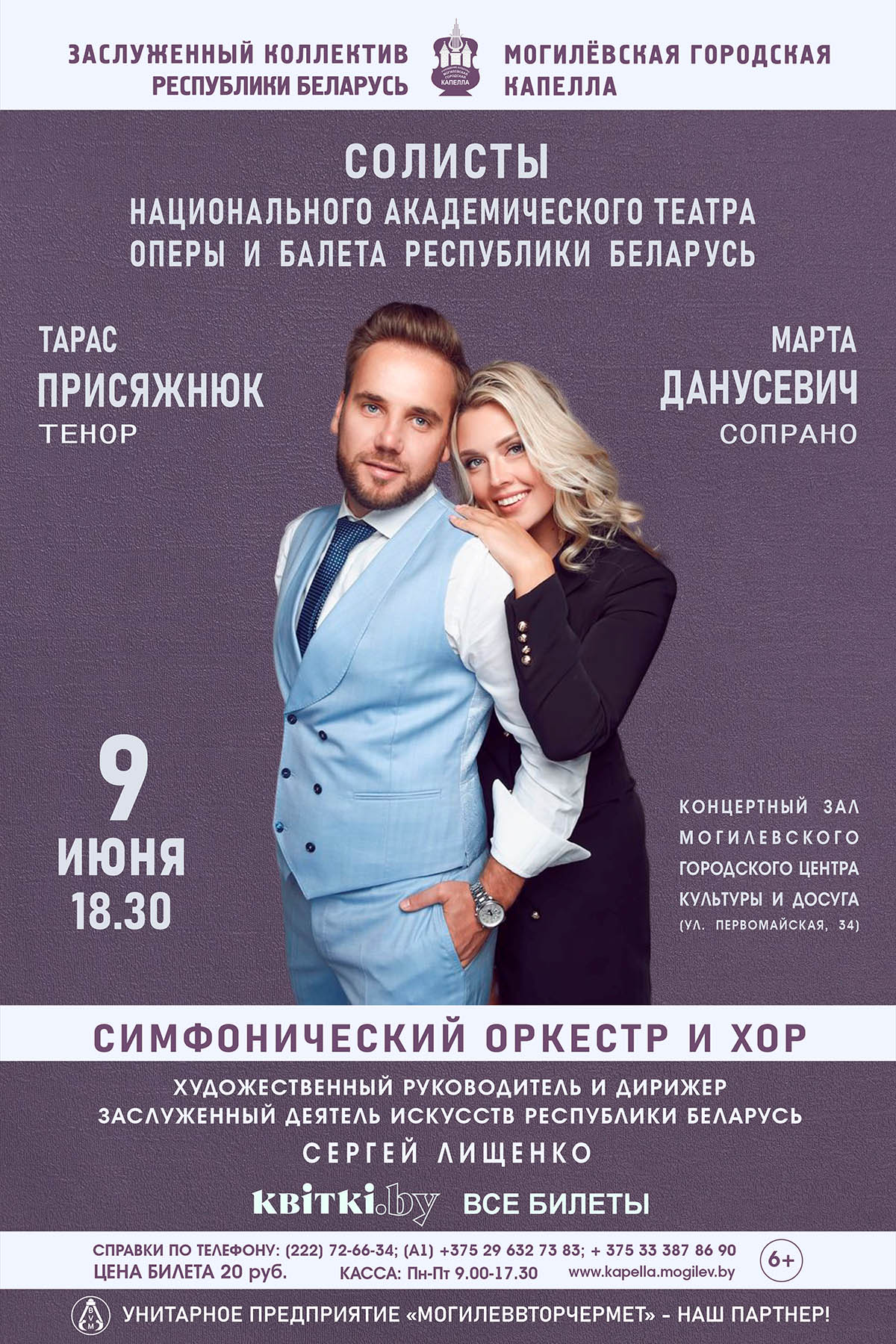 Солисты Национального академического театра оперы и балета Республики Беларусь Марта Данусевич (сопрано) и Тарас Присяжнюк (тенор) выступят 9 июня в областном центре в сопровождении симфонического оркестра и хора Могилевской городской капеллы.