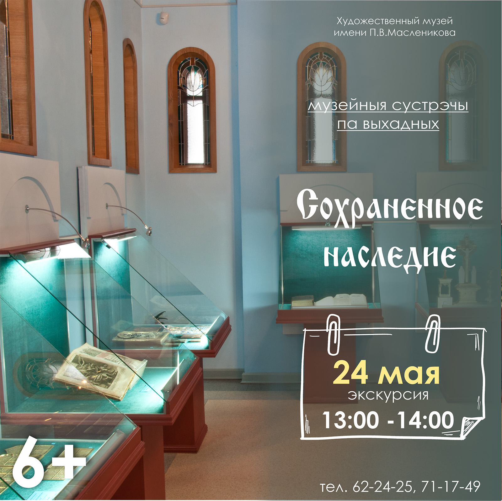 В субботу, 24 мая, в учреждении культуры пройдет экскурсия по постоянно действующей экспозиции «Сохраненное наследие» (6+), во время которой горожанам расскажут о старинных книгах, фресках и иконах, а также могилевчане посетят таинственную комнату-сейф. Начало экскурсии в 13:00.