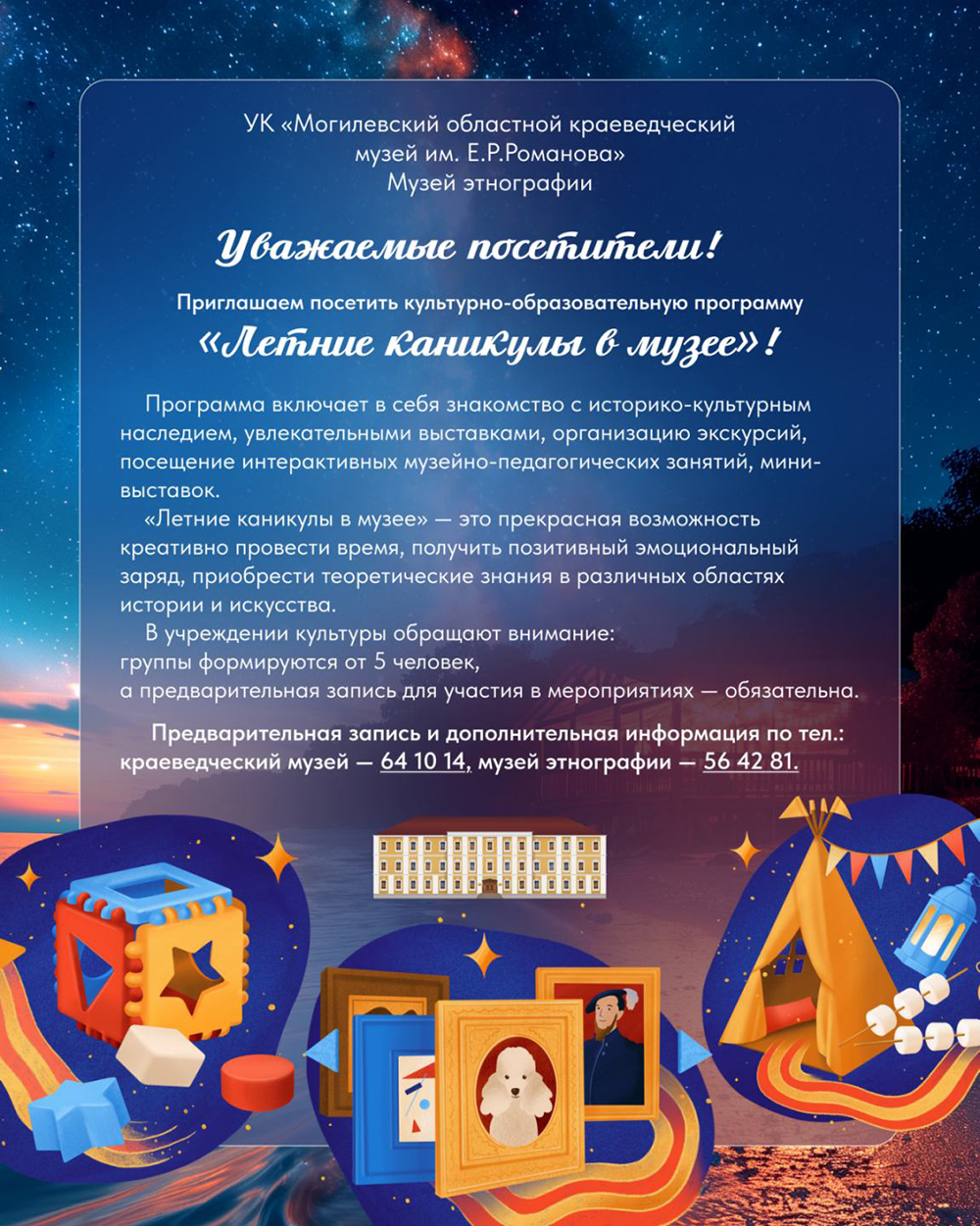 Могилевский областной краеведческий музей им.Е.Р.Романова и музей этнографии подготовили для юных могилевчан культурно-образовательную программу «Летние каникулы в музее». Она включает в себя знакомство с историко-культурным наследием, увлекательными выставками, а также организацию экскурсий и посещение интерактивных музейно-педагогических занятий.
