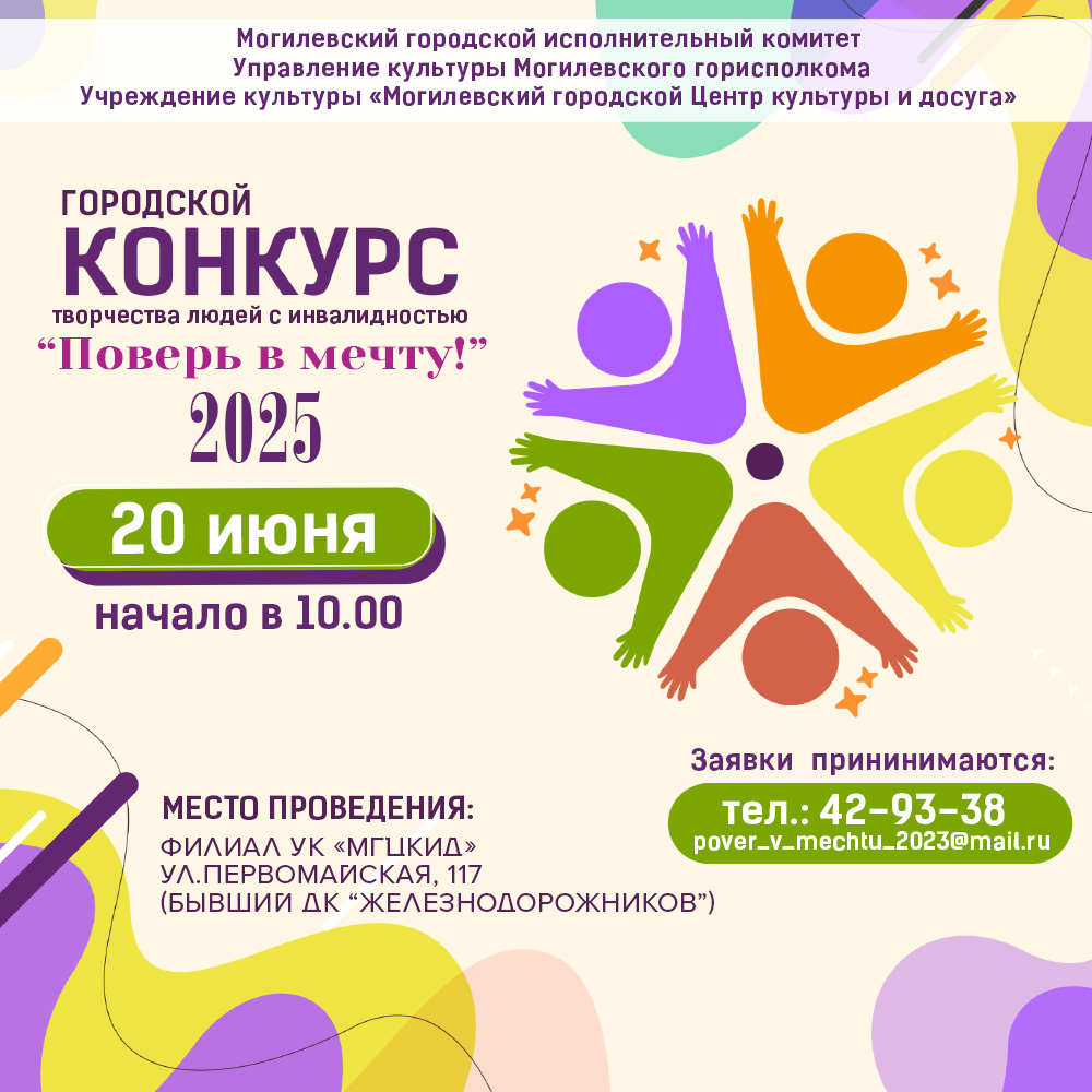 Городской конкурс творчества людей с инвалидностью «Поверь в мечту!» пройдет 20 июня в Могилеве. Мероприятие состоится на сцене филиала городского Центра культуры и досуга (ул.Первомайская, 117; бывший ДК железнодорожников).