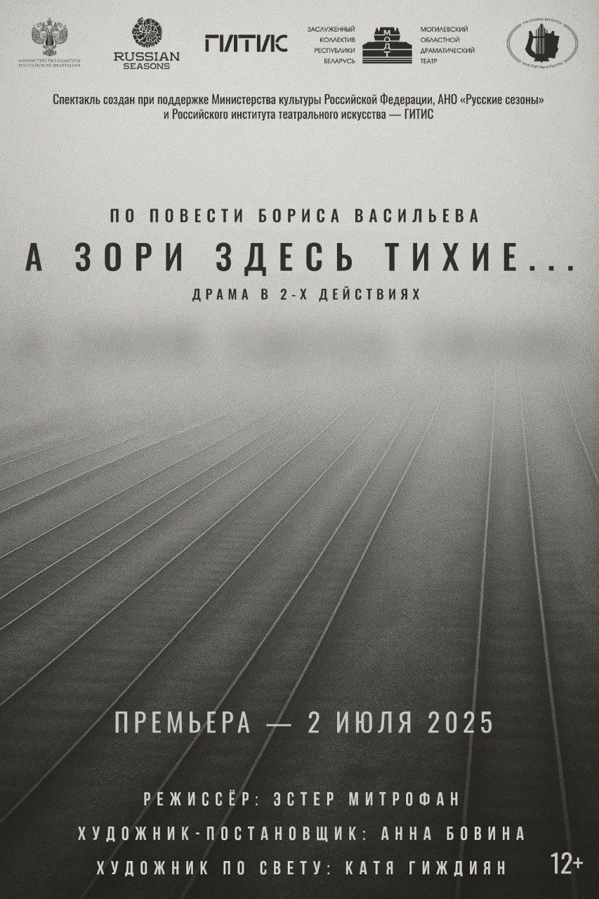 Премьеру спектакля «А зори здесь тихие…» по одноименной повести Бориса Васильева готовит Могилевский областной драматический театр. Над постановкой работает режиссер Эстер Митрофан. Увидеть спектакль жители областного центра смогут в июле – премьерные показы пройдут 2, 10 и 25 июля (начало в 18:30).