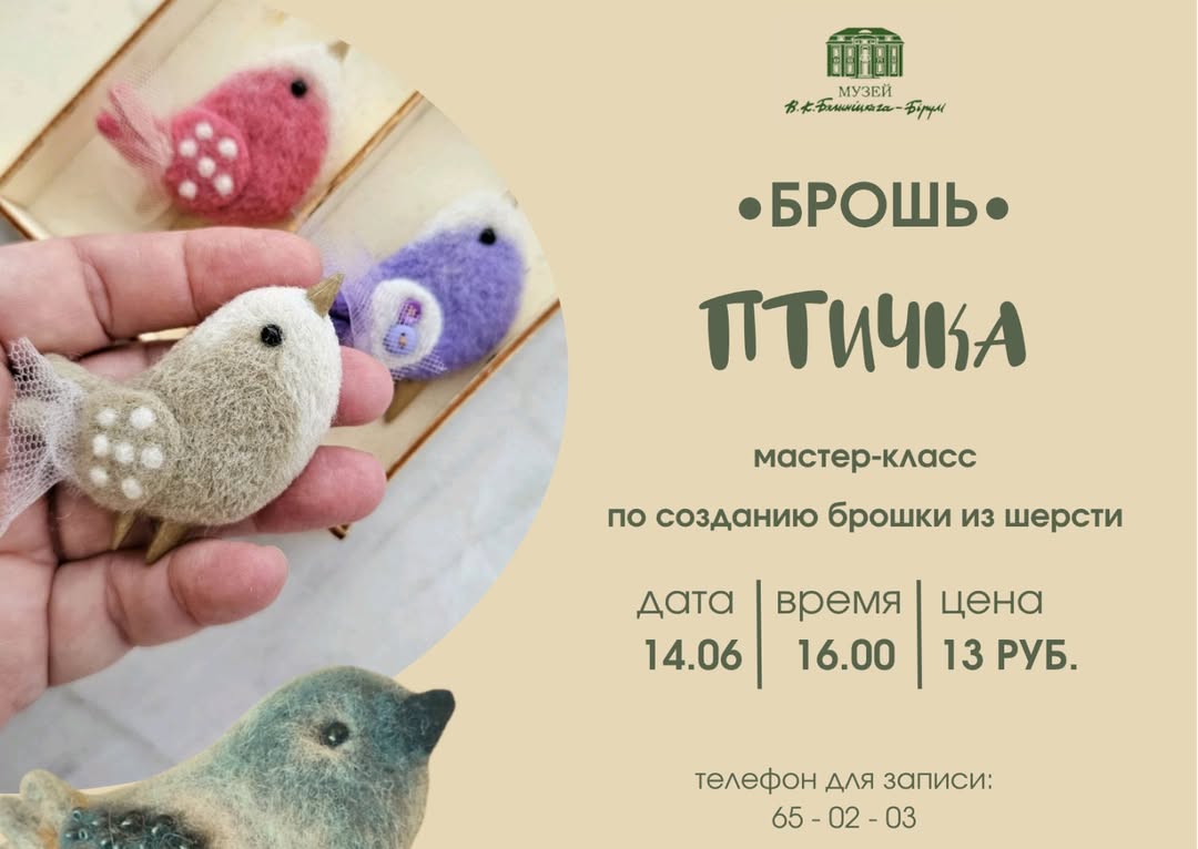 Мастер-класс по созданию броши из шерсти пройдет в музее В.К. Бялыницкого-Бирули 14 июня (суббота). Во время мероприятия могилевчане своими руками создадут брошь «Птичка».