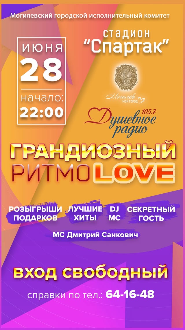 Концерт-дискотека «Грандиозный РитмоLove» от «Душевного радио» состоится 28 июня на стадионе «Спартак» в Могилеве.