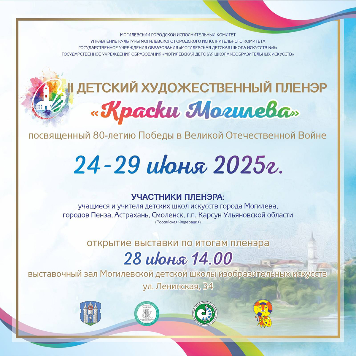 С 24 по 29 июня в областном центре пройдет II детский художественный пленэр «Краски Могилева», сообщили в управлении культуры горисполкома. Творческий проект посвящен 80-й годовщине Победы советского народа в Великой Отечественной войне.