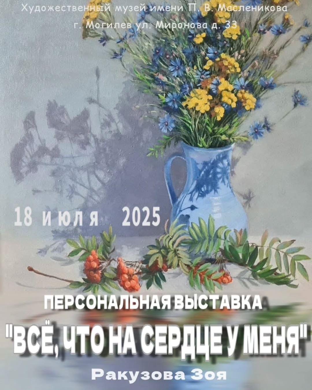 Торжественное открытие персональной выставки могилевской художницы Зои Ракузовой «Всё, что на сердце у меня» состоится в художественном музее имени П.В. Масленикова 18 июля. Об этом сообщили в учреждении культуры.
