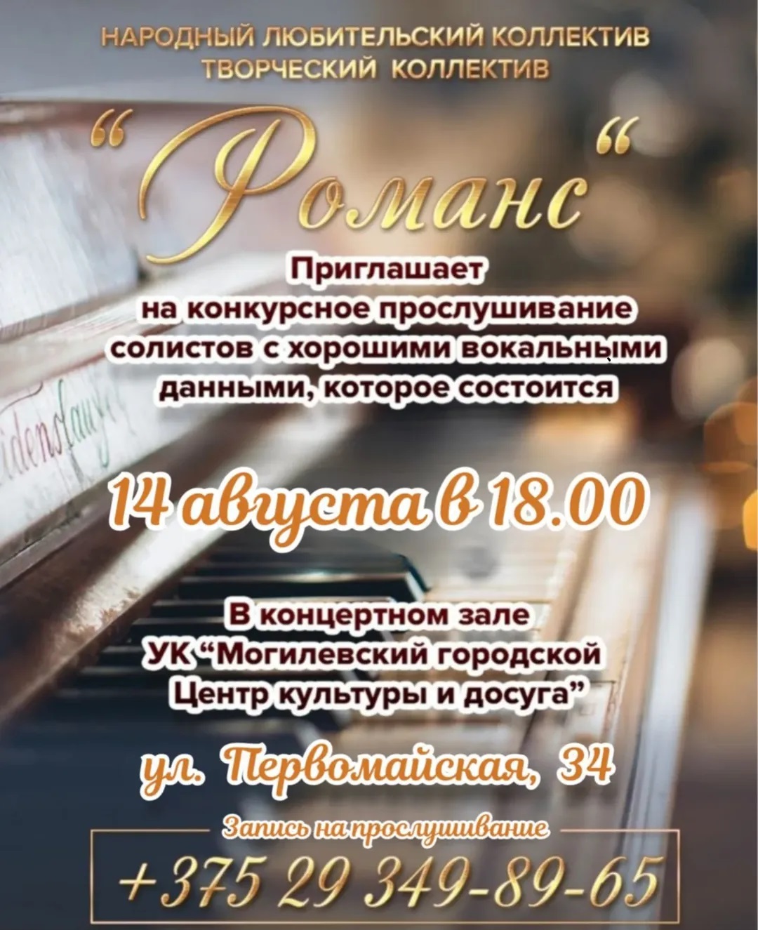 Народный творческий коллектив «Романс» приглашает на конкурсное прослушивание солистов в возрасте от 35 до 65 лет с хорошими вокальными данными.