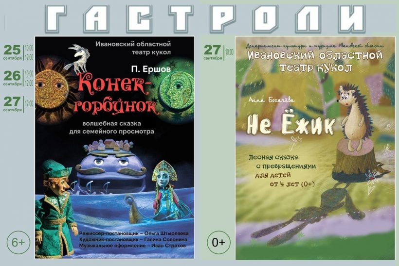 Ивановский областной театр кукол 25-27 сентября посетит с гастролями Могилев. В гастрольной афише — волшебная сказка «Конек-горбунок» П.Ершова (режиссер Ольга Штырляева) и спектакль «Не Ёжик» по одноименной сказке А.Богачёвой (режиссер-постановщик — заслуженный артист России Владимир Кузнецов). Постановки будут представлены на сцене Могилевского областного театра кукол.