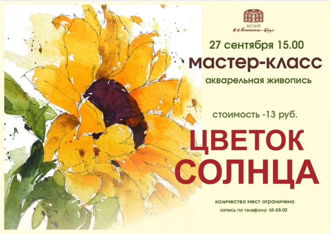 Мастер-класс по акварельной живописи «Цветок солнца» пройдет в субботу, 27 сентября, в музее В.К.Бялыницкого-Бирули (ул.Ленинская, 37).