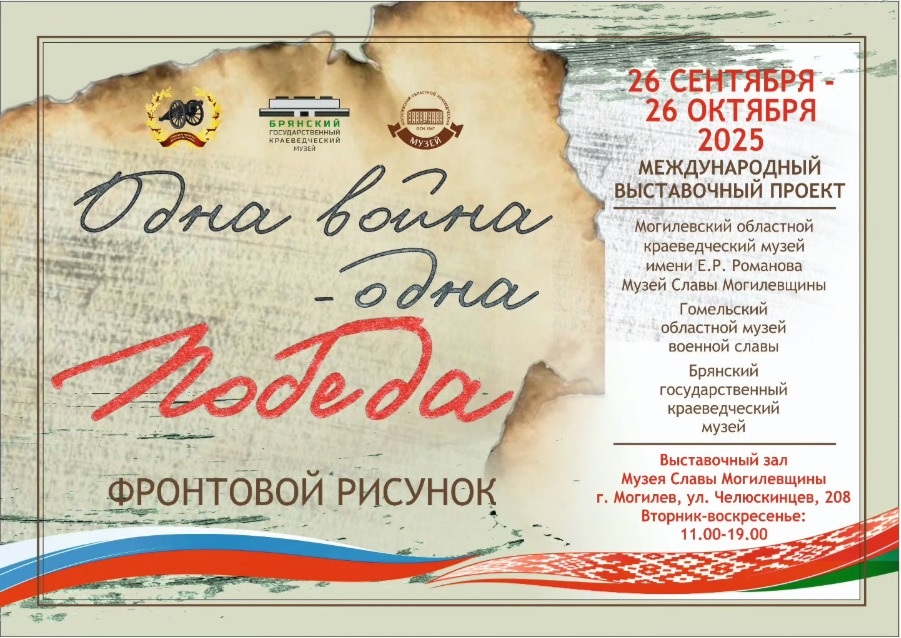 В пятницу, 26 сентября, в Музее Славы Могилевщины состоится открытие совместного российско-белорусского выставочного проекта «Одна война – одна Победа». Авторами проекта выступили Брянский государственный краеведческий музей, Гомельский областной музей военной славы и Могилевский областной краеведческий музей им. Е.Р.Романова.