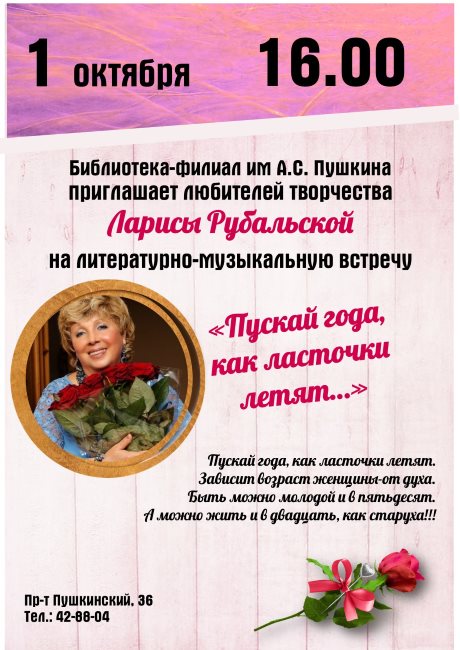 Литературно-музыкальная встреча «Пускай года, как ласточки летят...», посвященная творчеству поэтессы Ларисы Рубальской, состоится в детской библиотеке-филиале им. А.С.Пушкина 1 октября. Об этом сообщили в учреждении культуры.