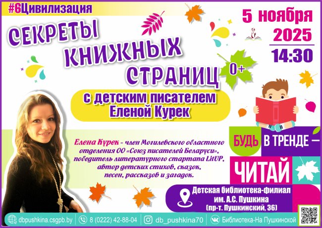 Творческая встреча с детской писательницей Еленой Курек состоится 5 ноября в детской библиотеке-филиале им. А.С.Пушкина (пр-т Пушкинский, 36).