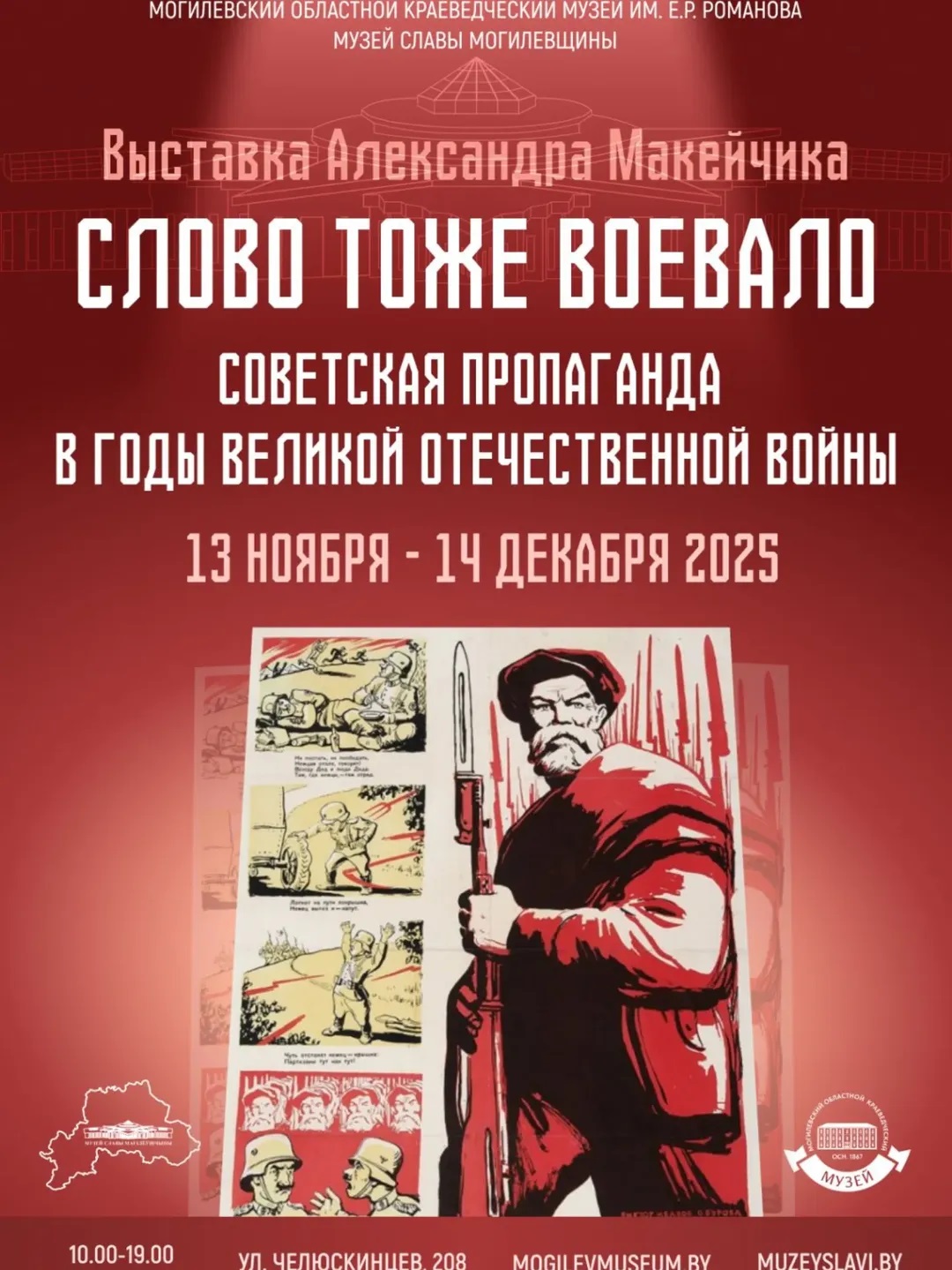 Так, в Музее Славы Могилевщины сегодня, 13 ноября, в 17:00 состоится открытие выставки «Слово тоже воевало», на которой будут представлены газеты, листовки и брошюры, как пример советской пропаганды в годы Великой Отечественной войны. Ознакомиться с экспозицией можно будет до 14 декабря.