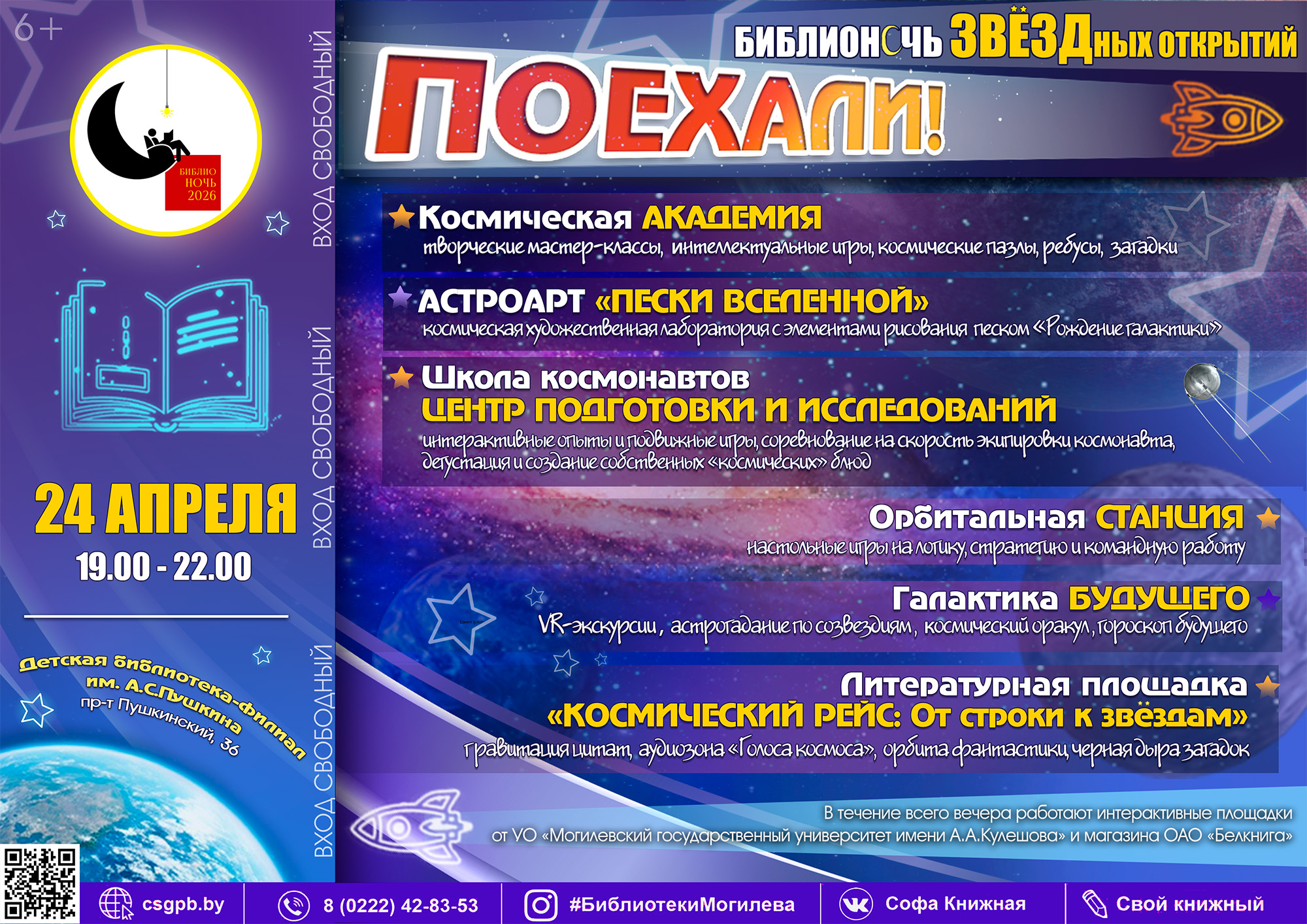 Библионочь звездных открытий «Поехали!» состоится в пятницу, 24 апреля, в детской библиотеке-филиале им. А.С.Пушкина в рамках акции «Библионочь — 2026». Мероприятие будет посвящено 65-летию первого полета человека в космос.