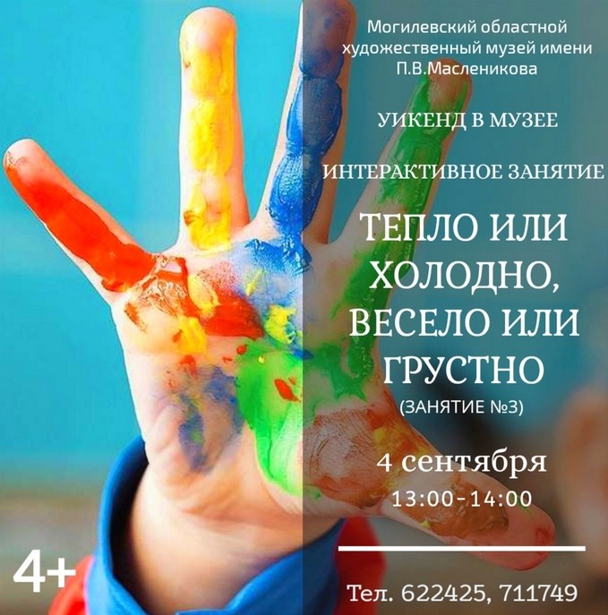Провести выходные вместе приглашает могилевчан художественный музей им.П.В.Масленикова. В рамках проекта «Уикенд» в музее» 4 сентября (суббота) с 13:00 до 14:00 в учреждении культуры пройдет интерактивное занятие «Тепло или холодно, весело или грустно».