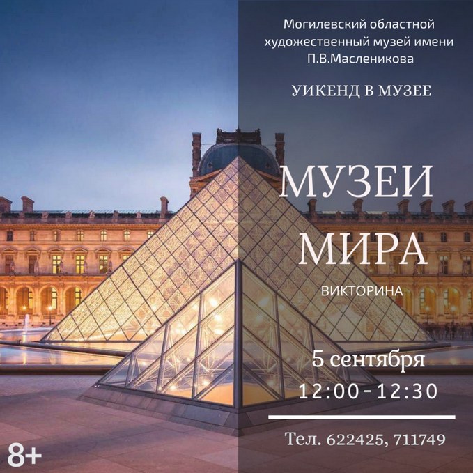 5 сентября (воскресенье) с 12:00 до 12:30 состоится викторина «Музеи мира». Пройдя ее, гости познакомятся с наиболее известными и значимыми музеями мира. После викторины могилевчане смогут ознакомиться с выставочным проектом могилевских художников «Родны край – крыніца натхнення».
