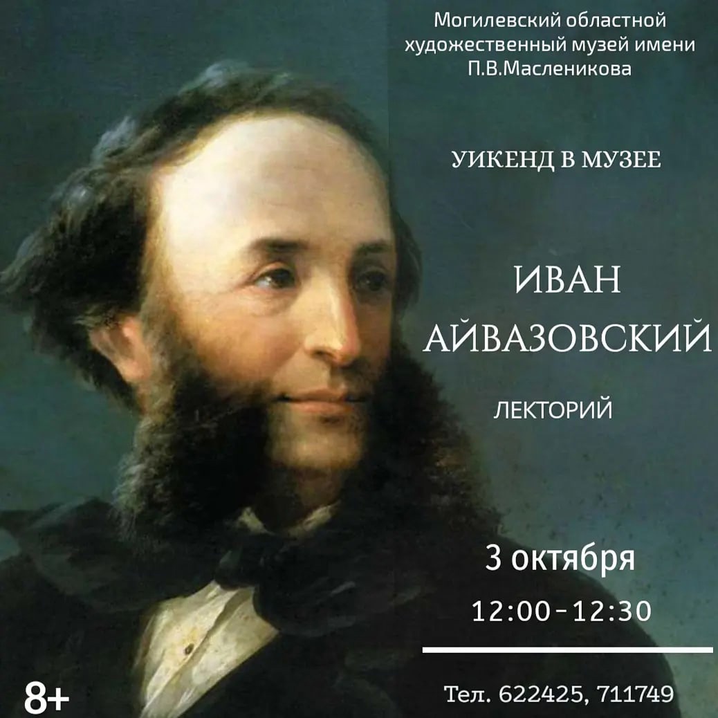 3 октября (воскресенье) с 12:00 до 12:30 в музее пройдет лекторий о творчестве и личности Ивана Айвазовского (8+). Могилевчан также ожидает просмотр документально-биографического фильма, а затем — знакомство с картинной галереей Народного художника Беларуси П.В. Масленикова.