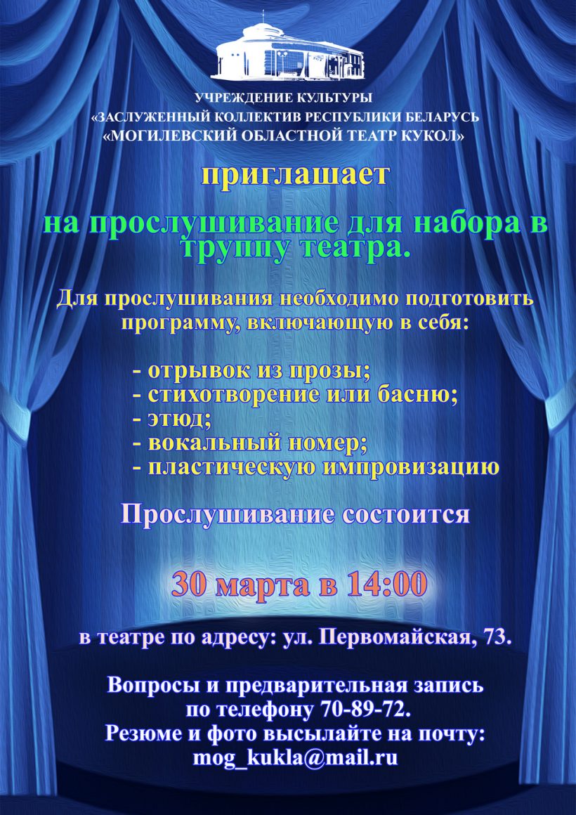 Заслуженный коллектив Республики Беларусь Могилевский областной театр кукол приглашает желающих на прослушивание для набора в труппу театра.