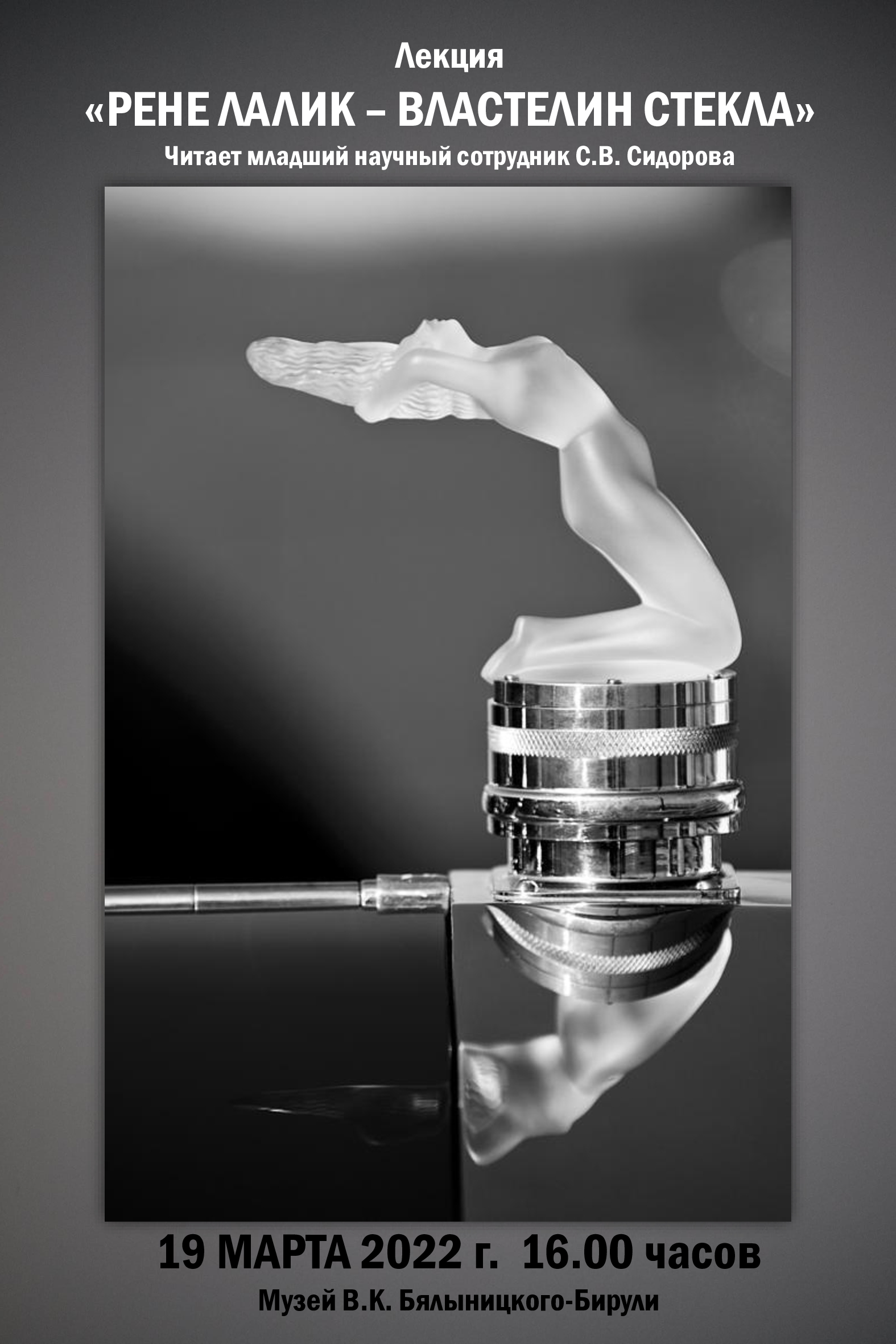 Арт-лекториум «Понятное искусство» продолжает свою работу в музее В. К. Бялыницкого-Бирули в Могилеве. 19 марта в 16.00 состоится вторая часть лекции «Жизнь и творчество Рене Лалика». На этот раз сотрудник музея Светлана Сидорова расскажет о стороне творчества французского ювелира, связанной с работой со стеклом.