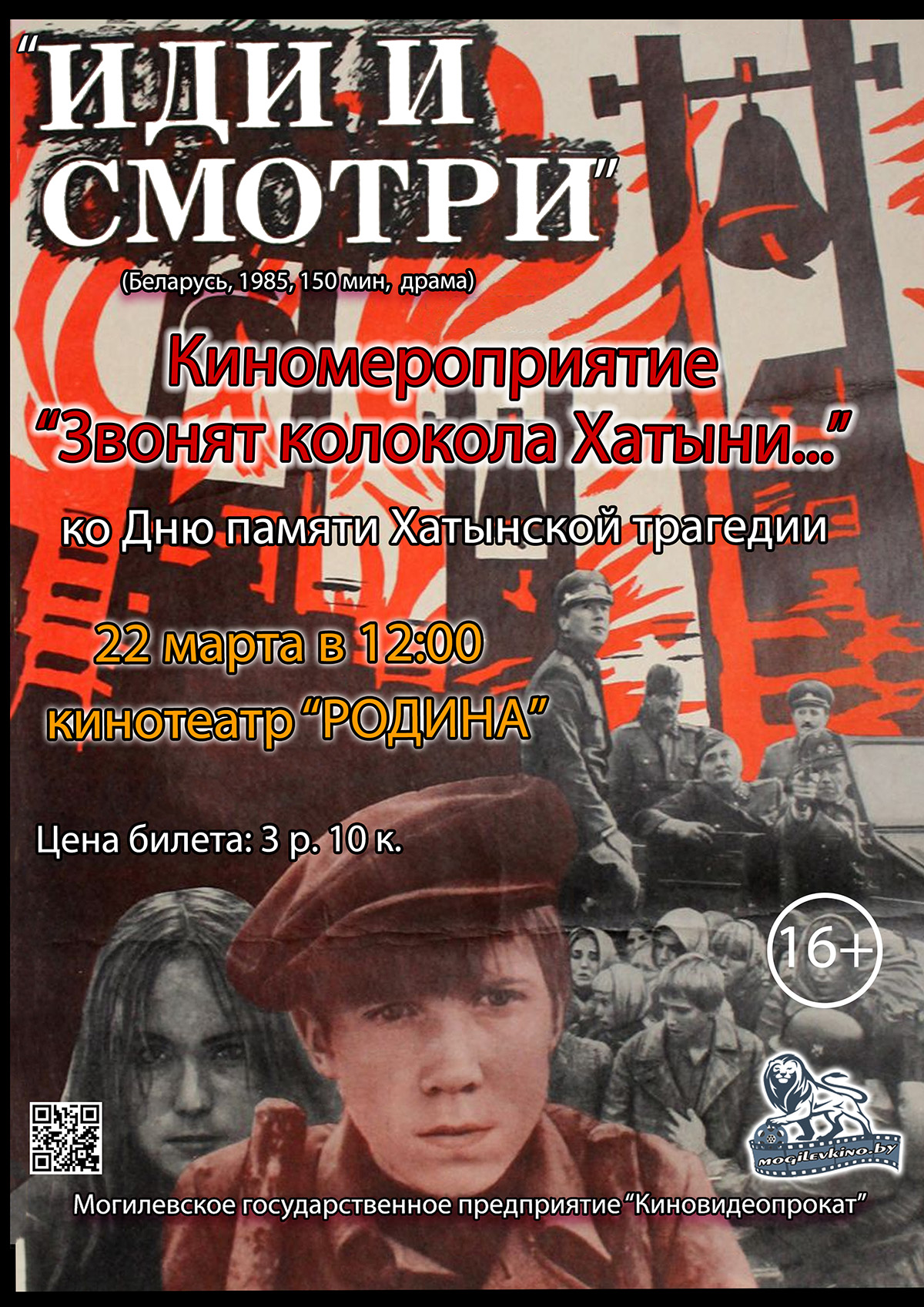 22 марта в могилевском кинотеатре «Родина» пройдет киномероприятие «Звонят колокола Хатыни...», приуроченное ко Дню памяти Хатынской трагедии. Об этом сообщили в государственном предприятии «Киновидеопрокат».