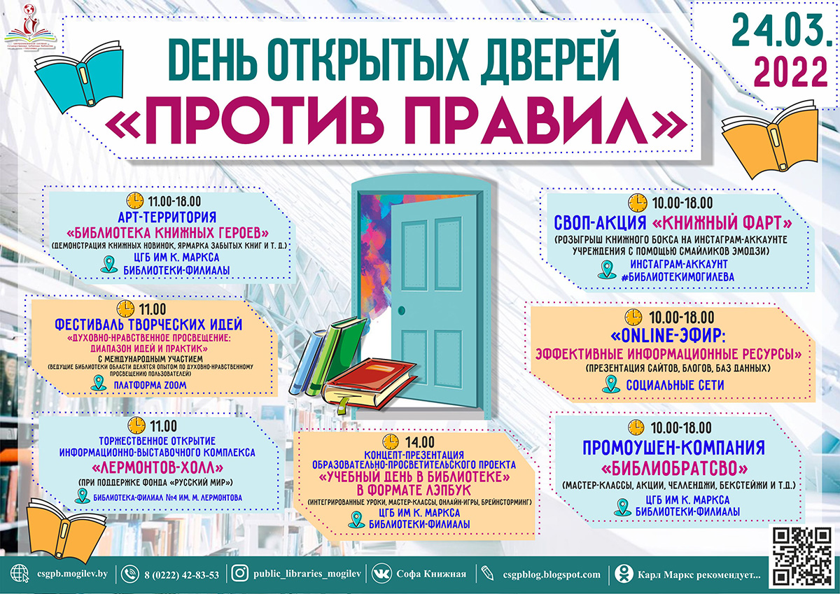Библиотеки Могилева 24 марта приглашают всех желающих погрузиться в мир креатива и веселья в рамках Дня открытых дверей «Против правил», который пройдет под слоганом «Читайте чаще, знайте больше, живите ярче!».