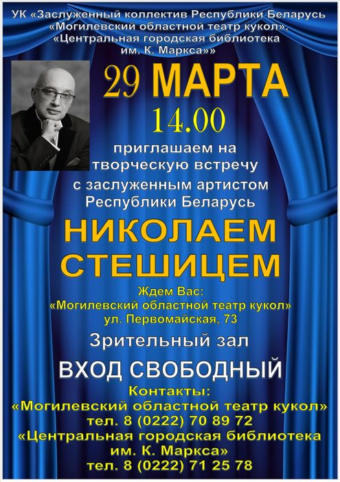 Творческая встреча с заслуженным артистом Республики Беларусь Николаем Стешицем, приуроченная к 45-летию Могилевского областного театра кукол и 25-летию творческой деятельности артиста, пройдет в Могилеве 29 марта. Мероприятие организует областной театр кукол совместно с центральной городской библиотекой им. К. Маркса.