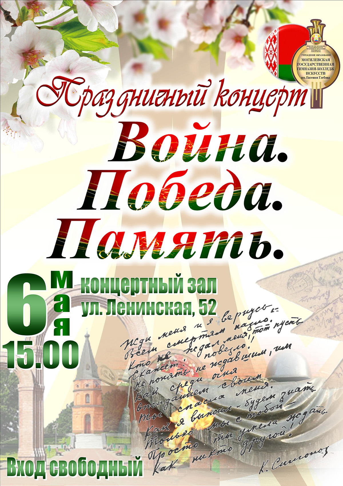 Праздничный концерт «Война. Победа. Память», посвященный Дню Победы, пройдет 6 мая в Могилевской государственной гимназии-колледже искусств имени Е.Глебова.