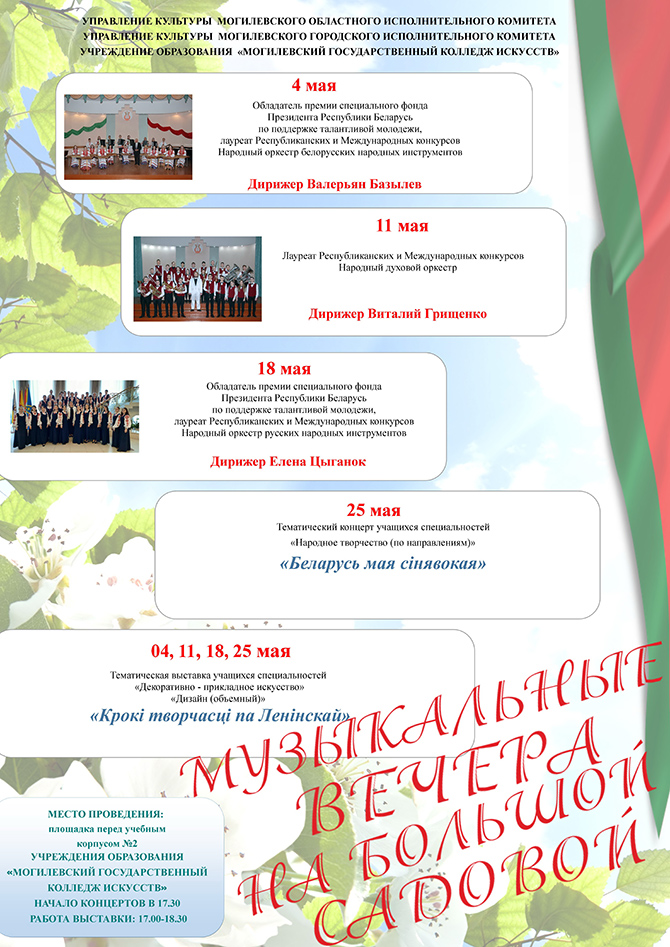 Каждую среду на протяжении всего мая на площадке перед учебным корпусом колледжа № 2 в 17:30 будут проходить концерты творческих коллективов колледжа, а также развернется выставка творческих работ учащихся «Крокі творчасці па Ленінскай».