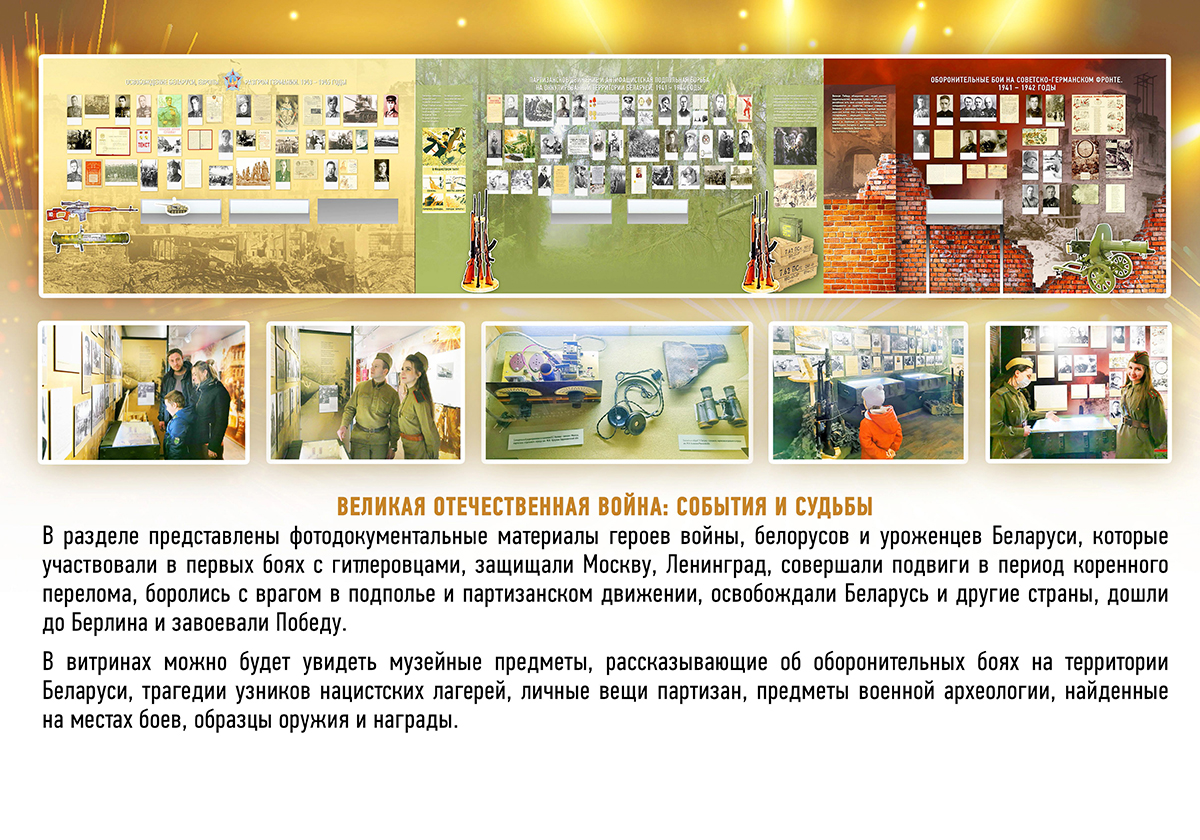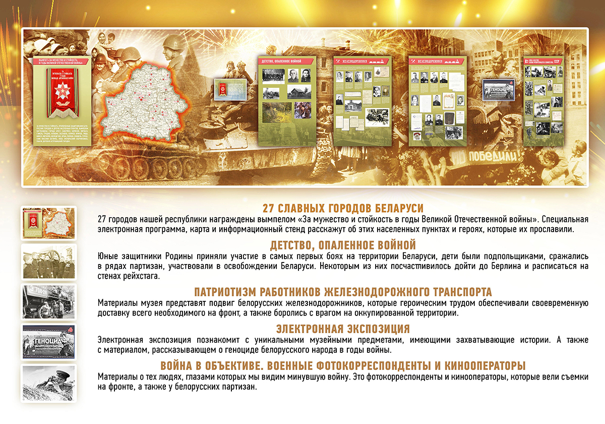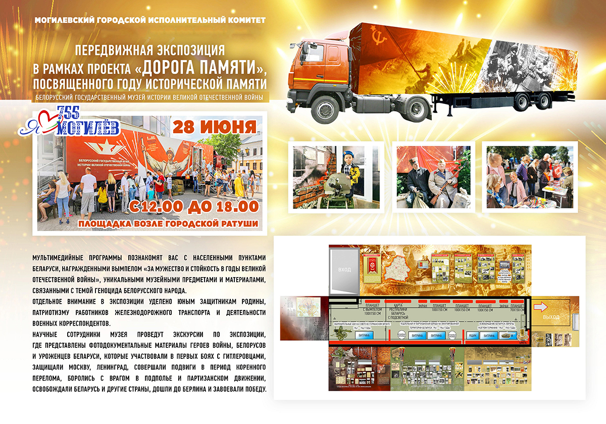 — В мобильном музее будут представлены 5 разделов, которые расскажут о начале войны на территории нашей страны, партизанах и подпольщиках, юных патриотах, ставших на защиту своей Родины от врагов, — отметили в музее истории Могилева. — Также можно будет познакомиться с историей освобождения Беларуси от немецко-фашистских захватчиков. Кроме этого, посетителям расскажут о героизме работников железнодорожного транспорта и роли военных фотокорреспондентов в освещении событий войны в кинолентах и фотографиях. Во время работы экспозиции экскурсоводы расскажут о геноциде белорусского народа в годы Великой Отечественной войны.