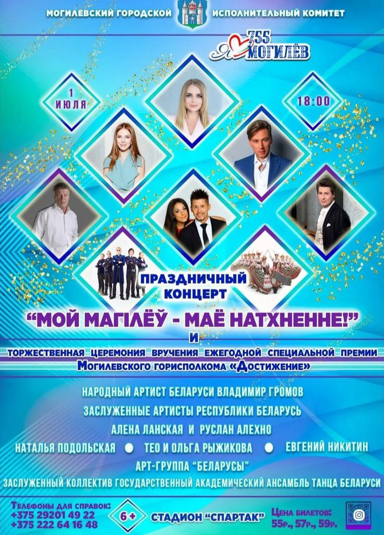 Праздничный концерт «Мой Магілёў — маё натхненне» пройдет в Могилеве 1 июля в рамках торжественной церемонии вручения ежегодной специальной премии Могилевского горисполкома «Достижение».