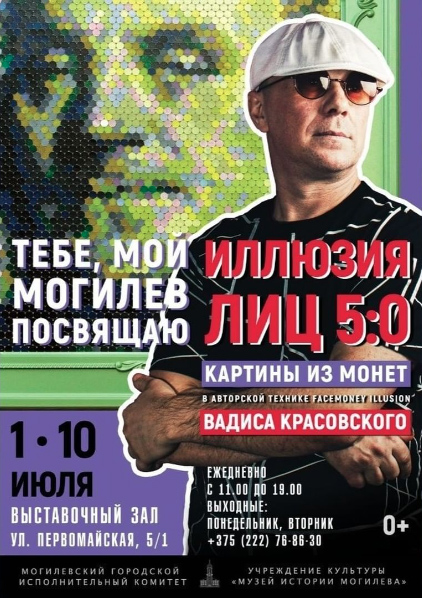 Вадим Красовский (творческий псевдоним Вадис) — белорусский художник, уроженец Могилева. Основной жанр, в котором он работает — портретная графика. И в данной выставке, которую автор назвал «Иллюзия лиц 5:0. Оттенки жизни», представлены графические портреты. Но основную часть экспозиции составят портреты, выполненные из монет.