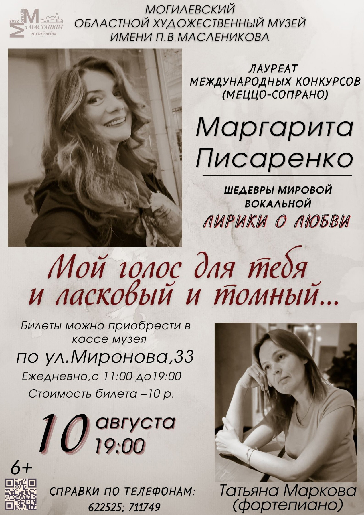 В Могилевском областном художественном музее имени П.В. Масленикова 10 августа состоится концерт лауреата международных конкурсов меццо-сопрано Маргариты Писаренко «Мой голос для тебя и ласковый и томный...».