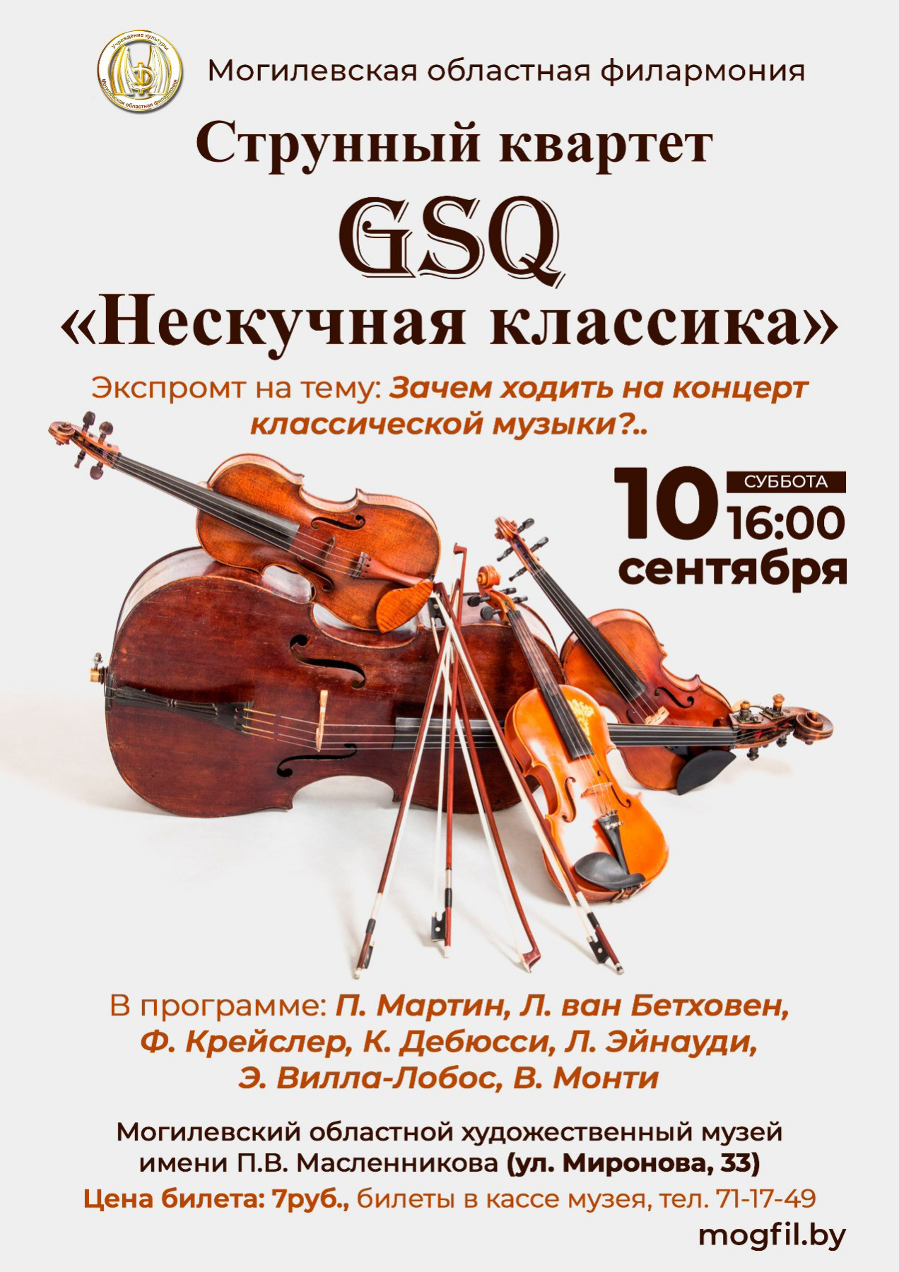 В музее имени П.В. Масленикова 10 сентября состоится концерт струнного квартета «GSQ» Могилевской областной филармонии. Коллектив выступит с программой «Нескучная классика».