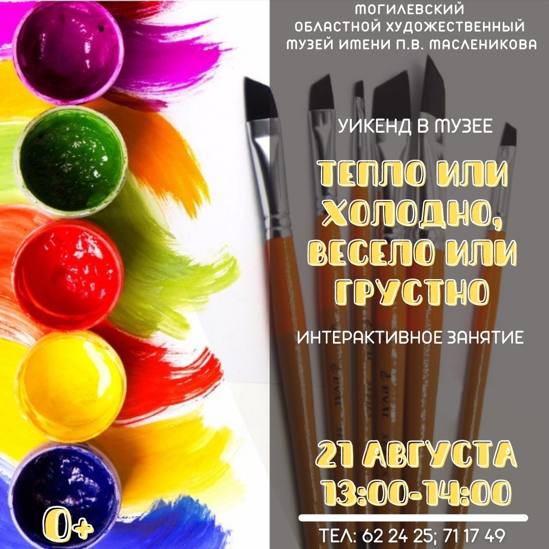 В воскресенье, 21 августа, пройдет интерактивное занятие «Тепло или холодно, весело или грустно» (0+). Оно рассчитано на детей дошкольного и младшего школьного возраста. Здесь малышей познакомят с основными цветами (синий, желтый, красный) и способами составления новых цветов и оттенков. Маленьким участникам мероприятия расскажут о цветах холодной и теплой гаммы, а также научат их различать. Начало в 13:00.