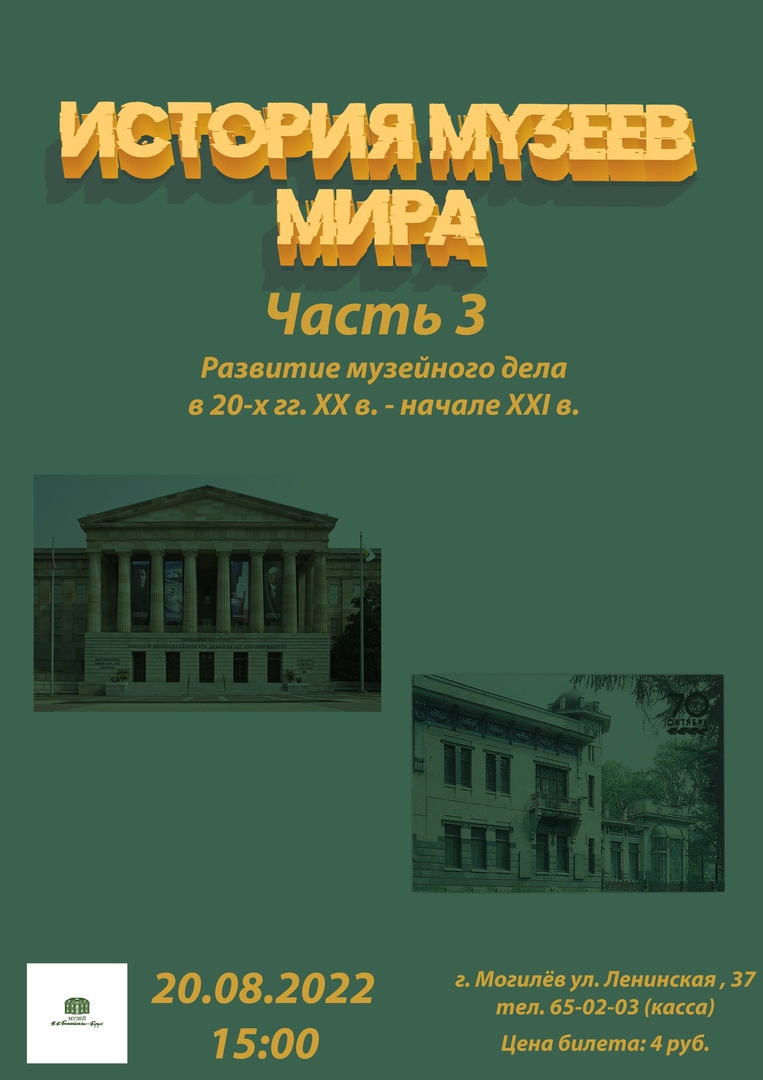 Лекция «История музеев мира. Часть 3: развитие музейного дела в 20-х гг. ХХ в. - начале ХХІ в.» пройдет в музее В.К. Бялыницкого-Бирули 20 августа. Об этом сообщили в учреждении культуры.
