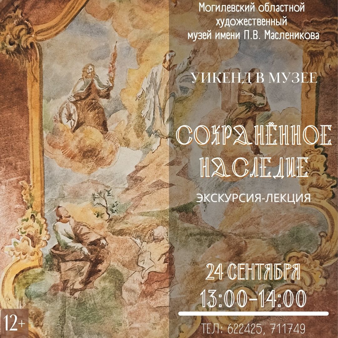 В субботу, 24 сентября, в музее состоится экскурсия-лекция по постоянно действующей экспозиции «Сохраненное наследие». В доступной и интересной форме у участников мероприятия будет возможность открыть для себя искусство Могилевщины, узнать историю школы монументальной живописи, иконописи, скульптуры и книжной гравюры.