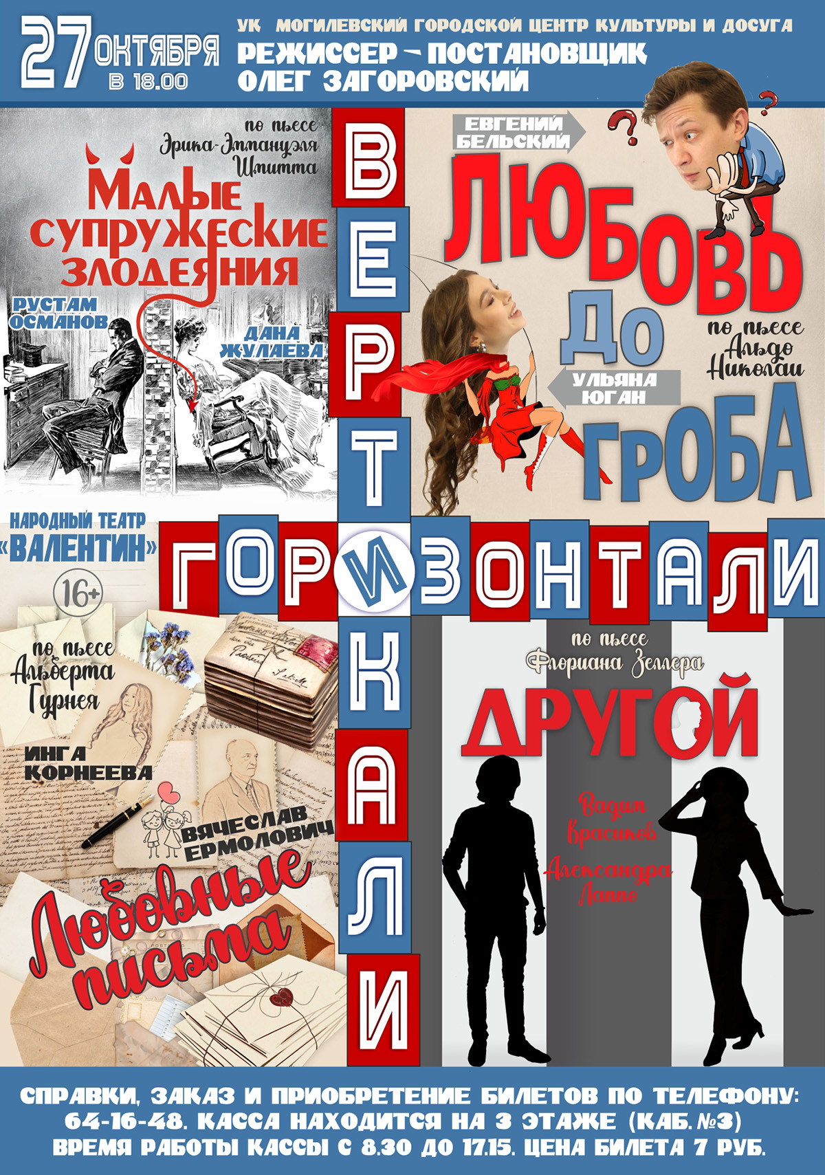Постановку «Вертикали и горизонтали» представит 27 октября на сцене Могилевского городского Центра культуры и досуга народный театр «Валентин» под руководством режиссера Олега Загоровского.