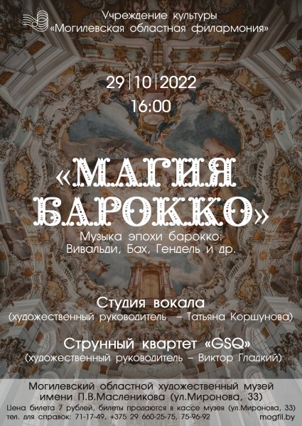 Могилевчан приглашают насладиться «Магией барокко» — совместный концерт студии вокала (художественный руководитель Татьяна Коршунова) и струнного квартета «GSQ» пройдет в областном художественном музее им. П. В. Масленикова 29 октября. Об этом сообщили в Могилевской областной филармонии.