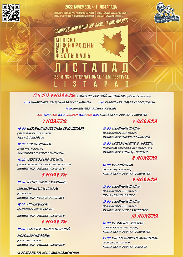 XXVIII Минский международный кинофестиваль «Лістапад» в этом году пройдет под слоганом «Истинные ценности». В кинотеатрах Могилева и Могилевской области кинопоказы в рамках фестиваля будут проходить с 4 по 10 ноября.