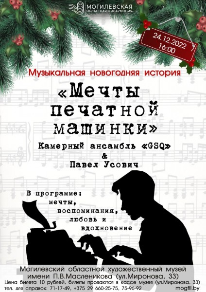 И еще!!! 24 декабря в 16:00 Могилевская областная филармония представит в музее имени П.В.Масленикова музыкальную новогоднюю историю «Мечты печатной машинки». В теплой атмосфере новогоднего праздника каждый сможет погрузиться в удивительный мир воспоминаний и грез писателя, которого сыграет Павел Усович, и его верного «друга», печатной машинки, которая за много лет совместного творчества разделила с ним не одну мечту. В исполнении камерного ансамбля «GSQ» и Петра Войченко для вас прозвучат произведения А. Пьяццолла, Д. Хисаиси, Г. Манчини, А. Цфасмана, Л. Андерсона и др.