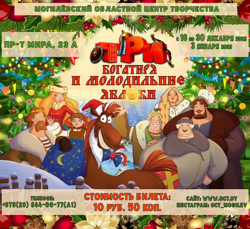 Могилевский областной центр творчества в этом году порадует новогодней музыкальной сказкой «Три богатыря и молодильные яблоки». Зрителей ждут новые приключения, подвиги полюбившихся героев и, конечно же, любовь, которая преодолевает преграды и побеждает все!
