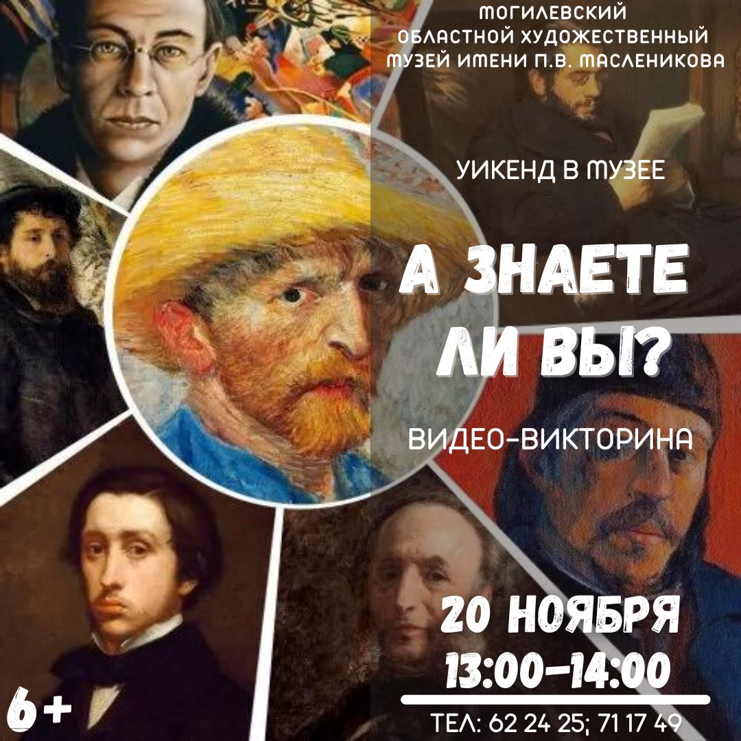 20 ноября (воскресенье) юных могилевчан приглашают на видео-викторину «А знаете ли вы?». Как отмечают в музее, художники подчас придумывают странные, неожиданные и необычные названия своим работам, приглашая зрителя разгадать скрытую связь между заголовком и изображением. Иногда на полотнах есть подсказки, которые позволяют понять ход мыслей живописца, — и это превращает расшифровку в интригующую игру. На мультимедийной викторине собраны работы знаменитых художников. Ребятам предложат отгадать знаменитые полотна и их авторов. Победителей викторины ждут призы.