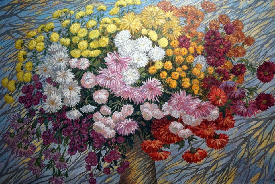 В арт-проекте, который называется «Клумбавосень», представлены более 50 живописных полотен автора. Здесь в основном ее любимые жанры — натюрморты, пейзажи. Но есть и композиции, воспевающие гимн природе, а также картины, на которых запечатлены легко узнаваемые места Могилева. Глядя на «Клумбувосень», зритель погружается в калейдоскоп красок, хотя за окном они блеклые.