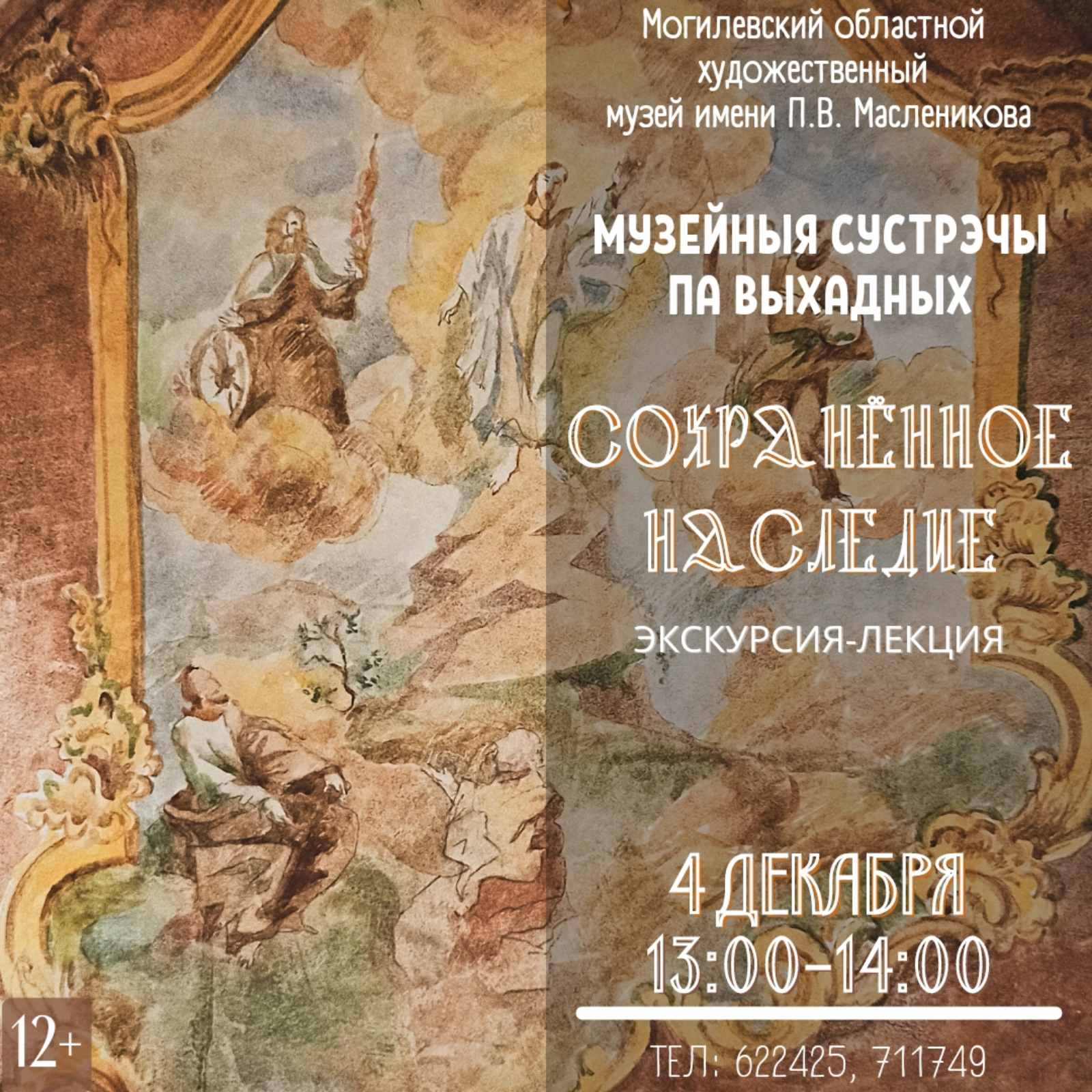 В воскресенье, 4 декабря, в музее пройдет экскурсия-лекция по постоянно действующей экспозиции «Сохраненное наследие». В доступной и интересной форме могилевчане откроют для себя искусство Могилевщины, узнают историю школы монументальной живописи, иконописи, скульптуры и книжной гравюры. Начало в 13:00.