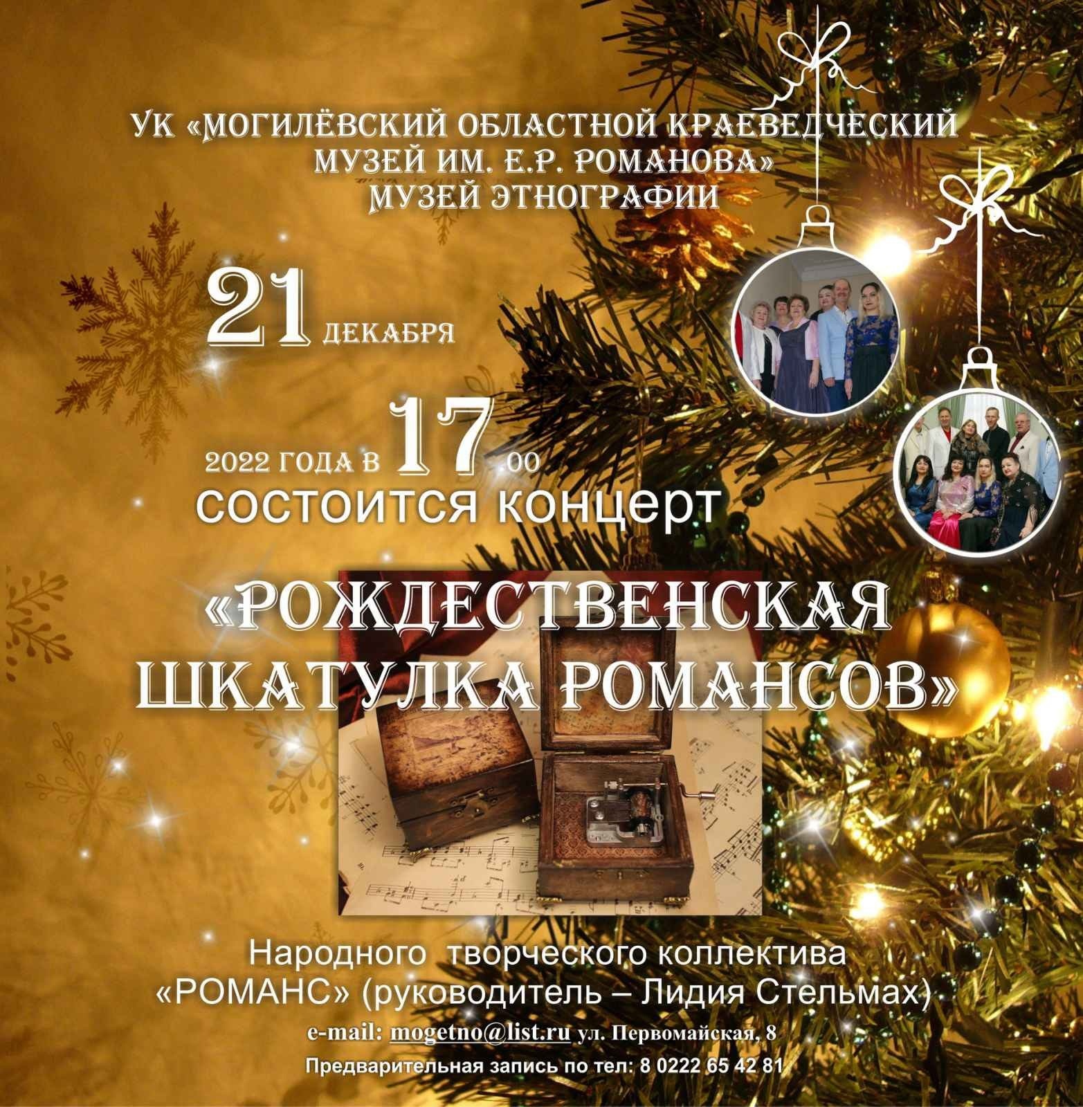 Концерт «Рождественская шкатулка романсов» пройдет в Могилеве 21 декабря. Программу представит народный творческий коллектив «Романс» под управлением Лидии Стельмах.