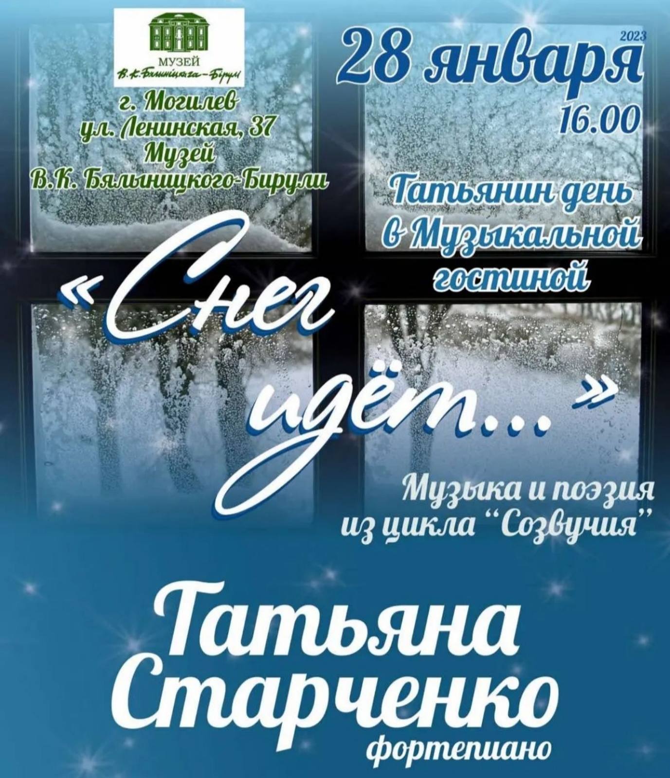 В музее В.К. Бялыницкого-Бирули 28 января пройдет концерт минской пианистки Татьяны Старченко. Музыкант представит программу «Снег идет...» из цикла «Созвучие».