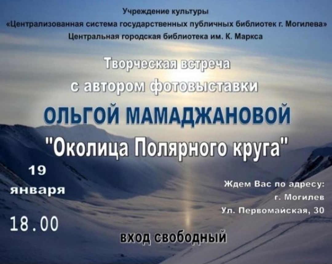 В Могилеве 19 января (четверг) состоится творческая встреча с Ольгой Мамаджановой, автором фотовыставки «Околица Полярного круга», которая проходит окнах библиотеки им. К.Маркса в рамках креатив-проекта «Арт-окно как объект культурного пространства библиотеки».