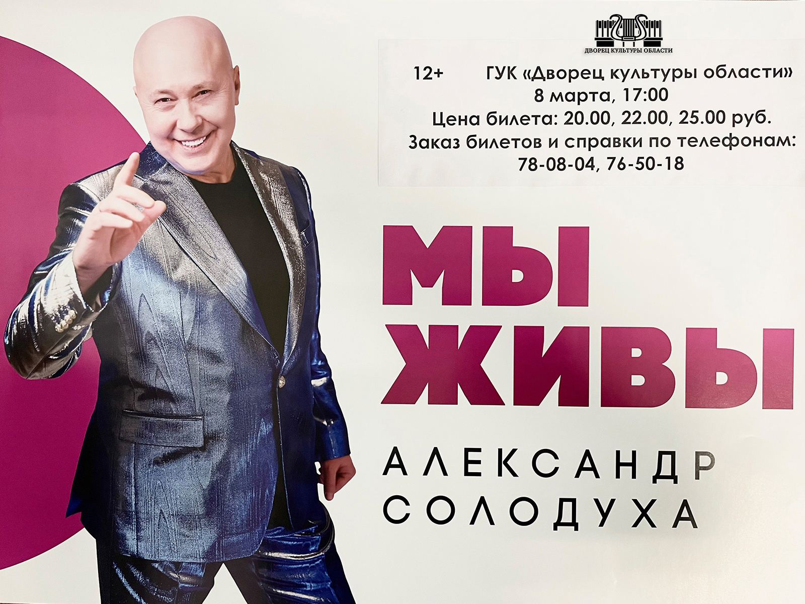 Концерт заслуженного артиста Республики Беларусь Александра Солодухи пройдет в Могилеве 8 марта. Программа «Мы живы!» будет представлена на сцене Дворца культуры области.