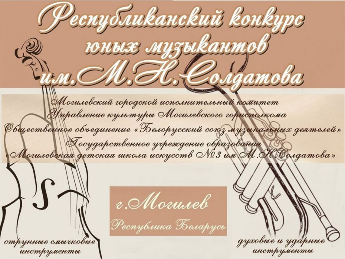 Могилевчан приглашают принять участие в Республиканском конкурсе юных музыкантов им. М.Н. Солдатова. Творческое состязание пройдет в два этапа. Первый (отборочный) состоится в первой декаде марта в учреждениях образования, второй (заключительный) — с 29 по 31 марта на базе Могилевской детской школы искусств № 3 им. М.Н. Солдатова.