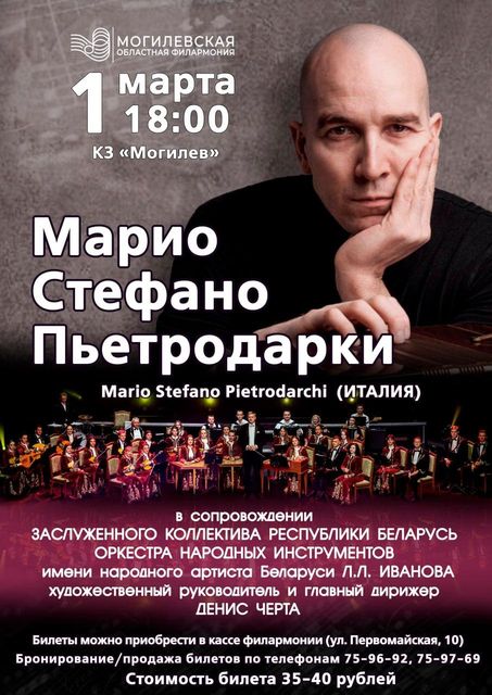 В Могилеве 1 марта состоится концерт Марио Стефано Пьетродарки. Итальянский мастер игры на бандонеоне, исполнитель, обладающий утонченным музыкальным вкусом, выступит в концертном зале «Могилев» в сопровождении заслуженного коллектива Республики Беларусь оркестра народных инструментов имени народного артиста Беларуси Л.Л. Иванова (художественный руководитель и главный дирижер Денис Черта).